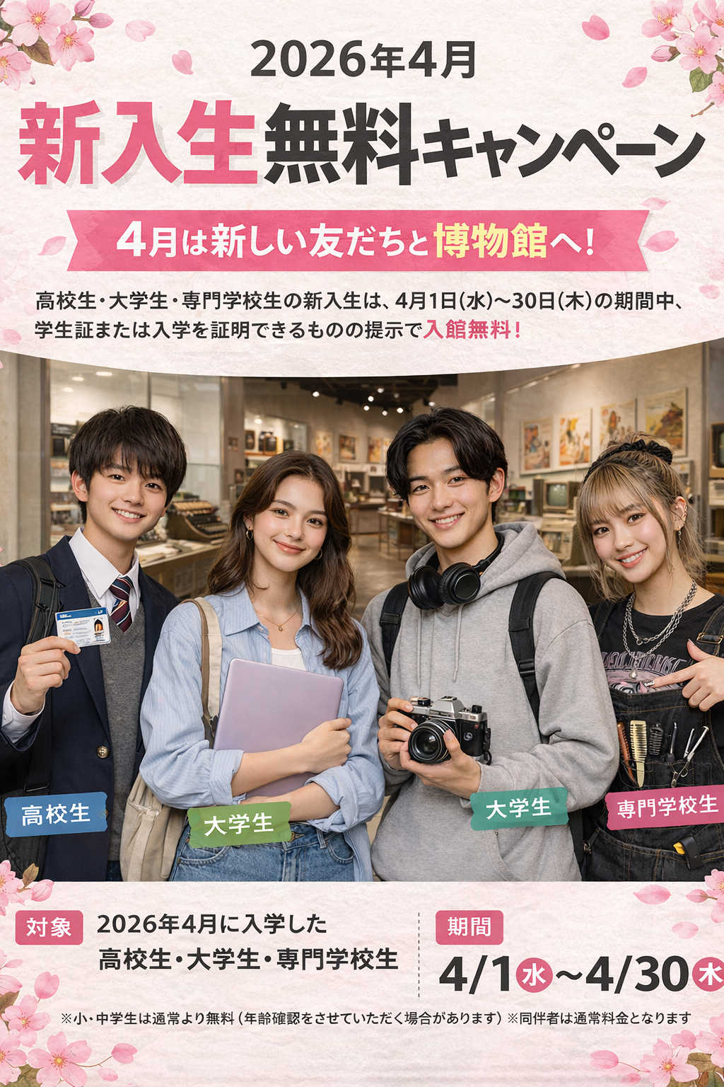 【お知らせ】4月の絶滅メディア博物館は「新入生無料キャンペーン」を開催!「絶滅メディア博物館」は義務教育課程の小学生・中学生はこども料金が適用されるので入館無料です!